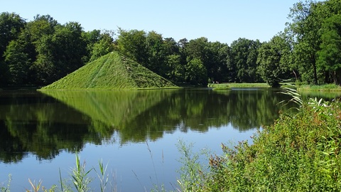 Ich hatte in der Nähe der "Ägyptischen Brücke" nur allgemein ein Zeichen "Suche im Umkreis von zehn Metern!" hinterlassen und zusätzlich zu der etwa zehn Meter entfernten Mini-Schokoladentafel deutlich näher die erste Flasche mit der Schatzkarte und dem im Roman beschriebenen Text darauf versteckt. Diese hatte ich auf altem Papier selbst gemalt und auch die Flasche mit Schlamm und püriertem und anschließend angetrocknetem Moos alt aussehen lassen - versiegelt mit der "strahlenden Pyramide". Selbstverständlich fanden meine beiden Mädchen diese zuerst!Als meine Frau und die Kinder nicht zum vereinbarten Treffpunkt kamen, ging ich ihnen entgegen und "staunte" über ihren Fund. Wir "berieten", ob man ihn beim Museum abgeben sollte oder erst einmal selbst versuchen sollte, den Schatz zu finden. Wir entschieden uns für die zweite Variante! Die nachfolgenden Wochen verbrachten wir mit der "Schatzsuche": Wir kauften eine Parkführer-Broschüre und stellten fest, dass es darin zwar eine Karte vom Park gab, die ein wenig gedreht auch etwas an einen Schädel erinnerte, und dass der "Schilfseeberg mit Wolfsschlucht" zwar aufgelistet, aber nicht eingezeichnet war. Wir waren bei jeder Gelegenheit und halbwegs gutem Wetter im Park und lösten nach und nach alle Rätsel und fanden dabei alle jeweils am Tag zuvor von mir versteckte Flaschen.